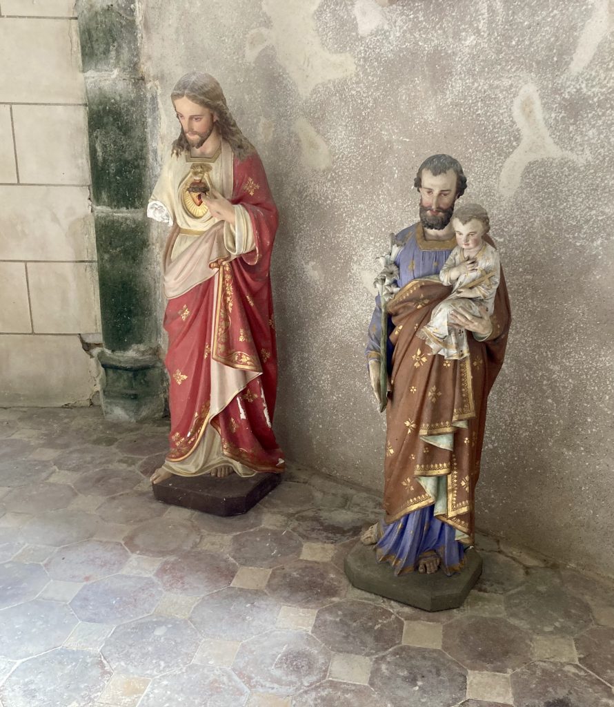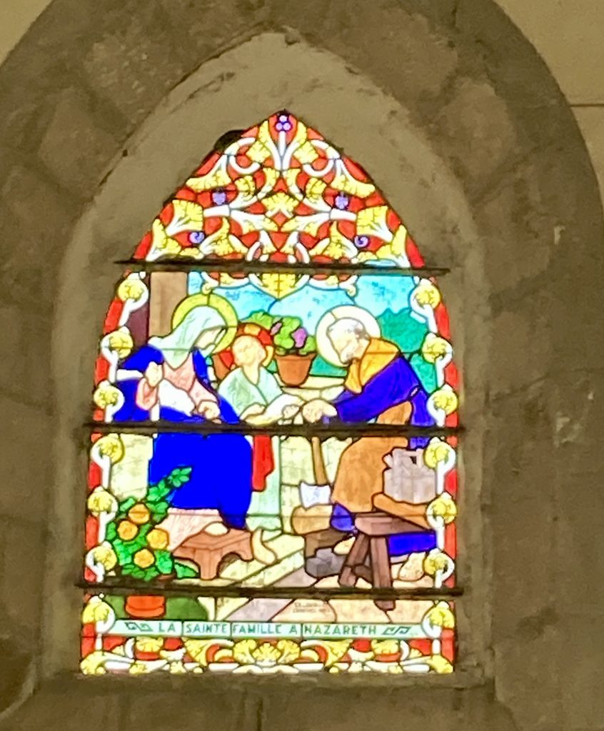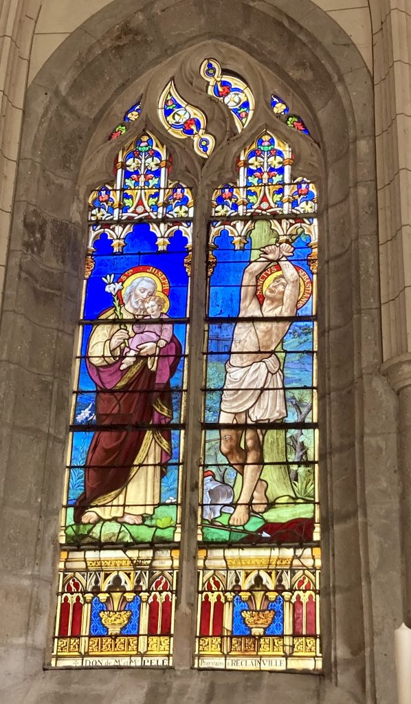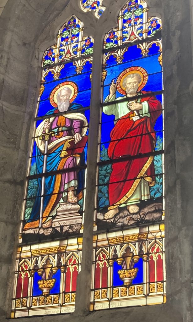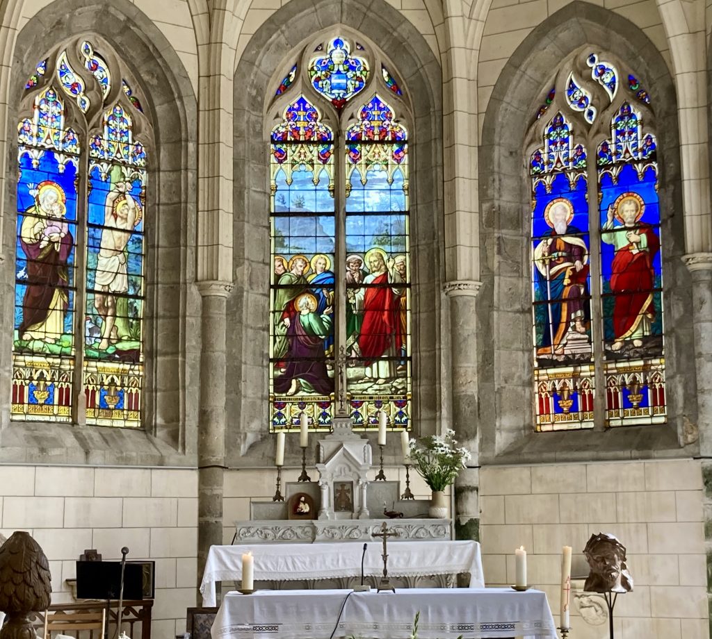 Le pavage de l’allée centrale, en pierres de Prasville, est plus récent, c’est-à-dire d’environ une centaine d’années. Vous remarquerez aussi quelques beaux vitraux, offerts à l’époque par des habitants de la Commune.