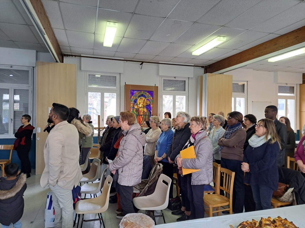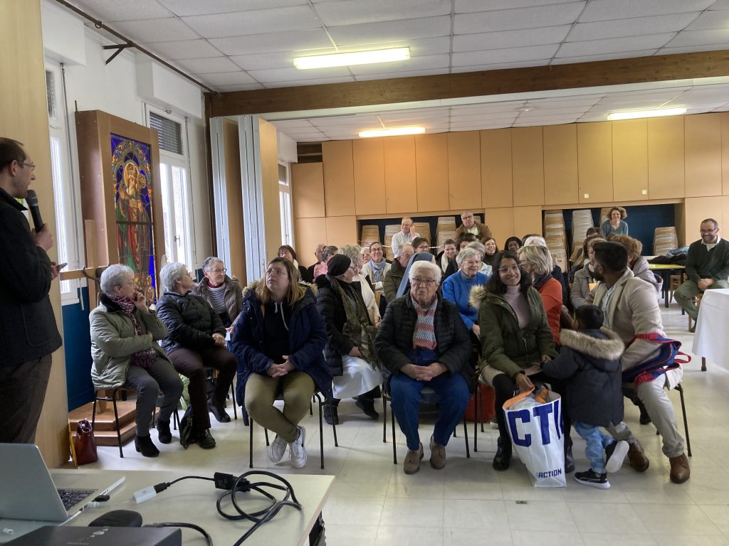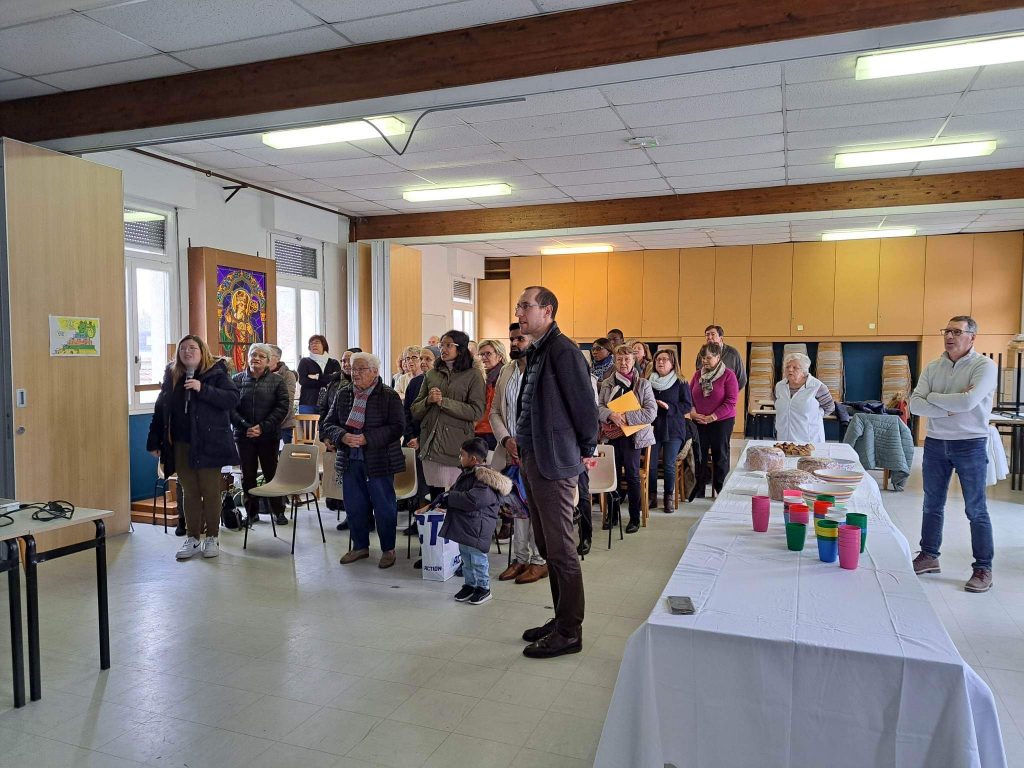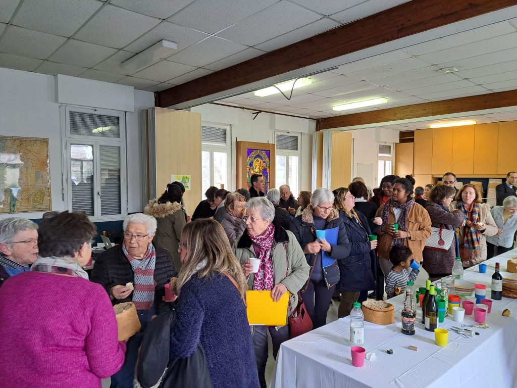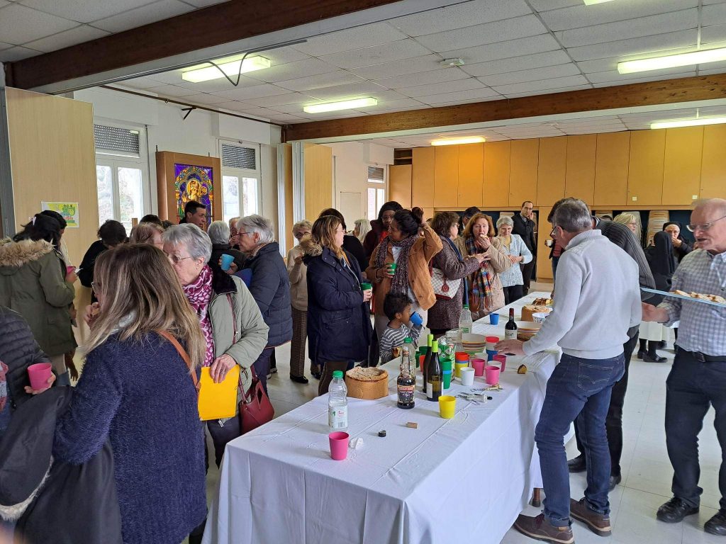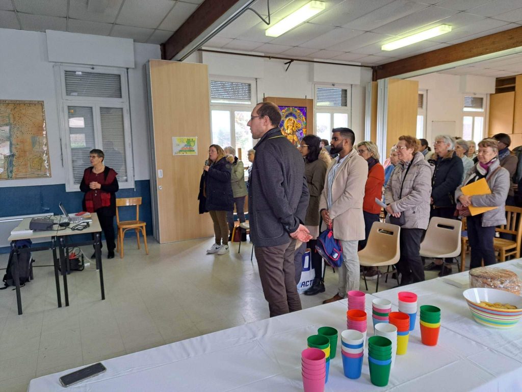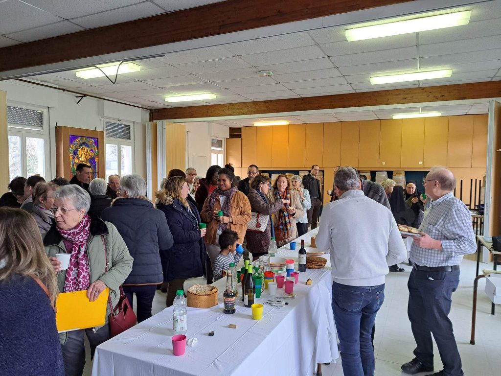 A l’invitation du père Silouane Deletraz, nous nous sommes retrouvés une soixantaine de personnes bénévoles de la paroisse. Les différentes équipes étaient représentées: équipe pastorale paroissiale, le conseil économique, la liturgie, sacristie, équipes mariage, baptême, deuil, relais des villages, distributeurs de sources vives, maintenance entretien, catéchèse, aumônerie, catéchuménat, servants d’autel, vie spirituelle et convivialité, communautés religieuses, accueil, communication…