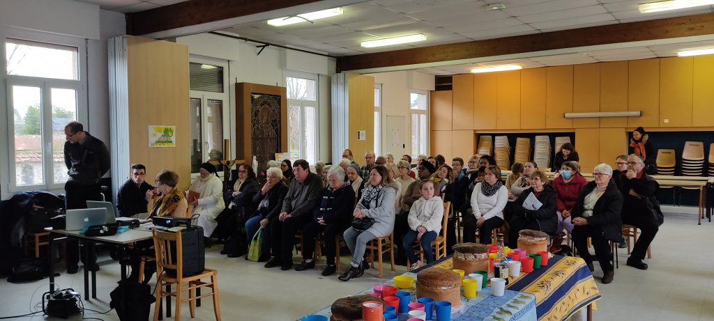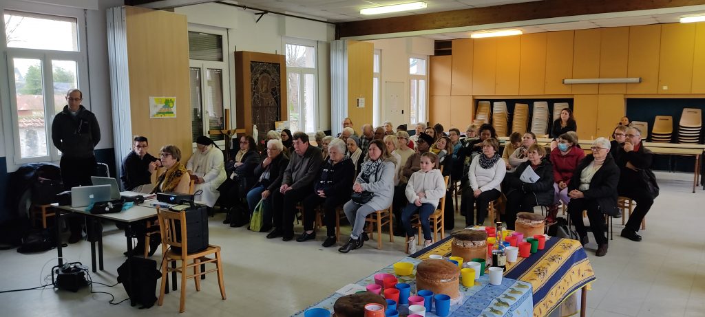 A l’invitation du père Silouane Deletraz, nous nous sommes retrouvés une cinquantaine de personnes bénévoles de la paroisse. Les différentes équipes étaient représentées: équipe pastorale paroissiale, le conseil économique, la liturgie, sacristie, équipes mariage, baptême, deuil, relais des villages, distributeurs de sources vives, maintenance entretien, catéchèse, aumônerie,MEJ (mouvement Eucharistique des jeunes), catéchuménat, servants d’autel, vie spirituelle et convivialité, communautés religieuses, accueil, communication…
