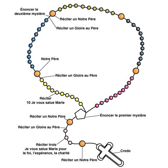 Dans la Prière du Chapelet, chaque mystère est annoncé ou médité et suivi d’une dizaine de JE VOUS SALUE MARIE appelée communément une dizaine de chapelet. Pour ne pas perdre le compte, les fidèles utilisaient un collier de cent cinquante grains, nommé « patenôtre », qui est à l’origine des chapelets actuels.